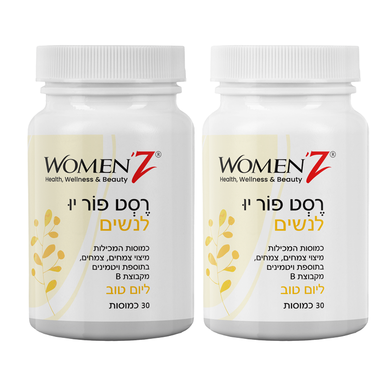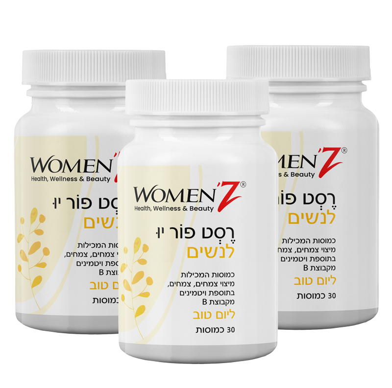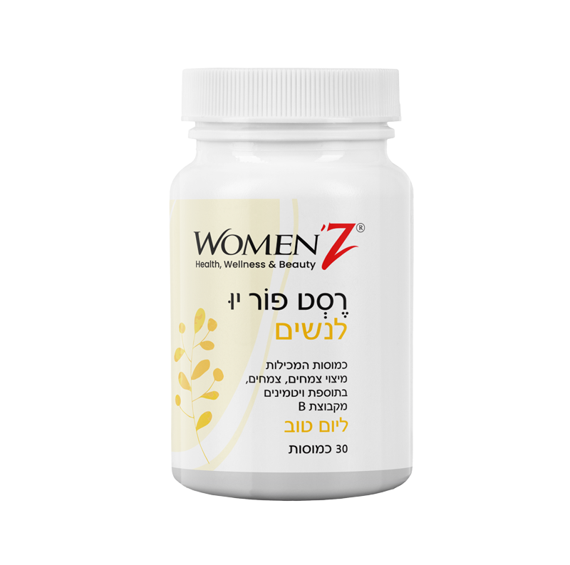 "רֶסְט-פוֹר-יוּ יום" לנשים של חברת WOMEN'Z הוא מוצר טבעי שפותח במיוחד עבורך. הוא יסייע לך בפעילות היומית התקינה ויאפשר לך לשמור על עצמך ממוקדת, שלווה, ערנית וצלולה בימים ארוכים ועמוסים, ובעיקר לפני מבחנים, לפני פגישות ולפני ישיבות חשובות.